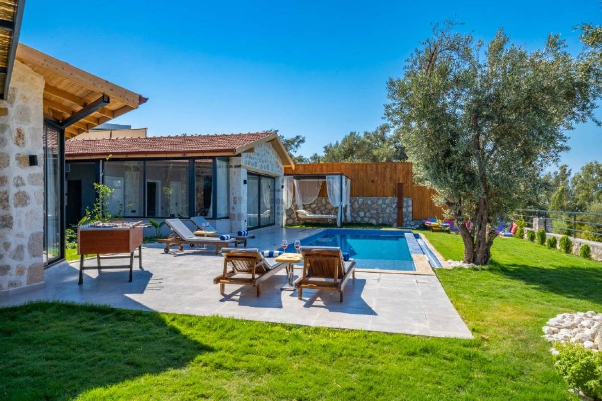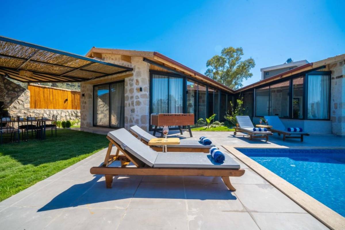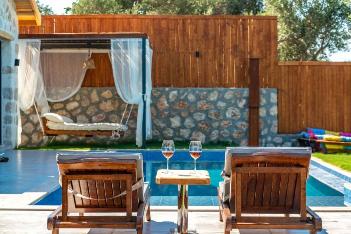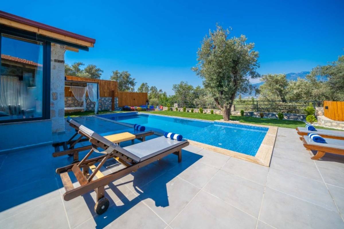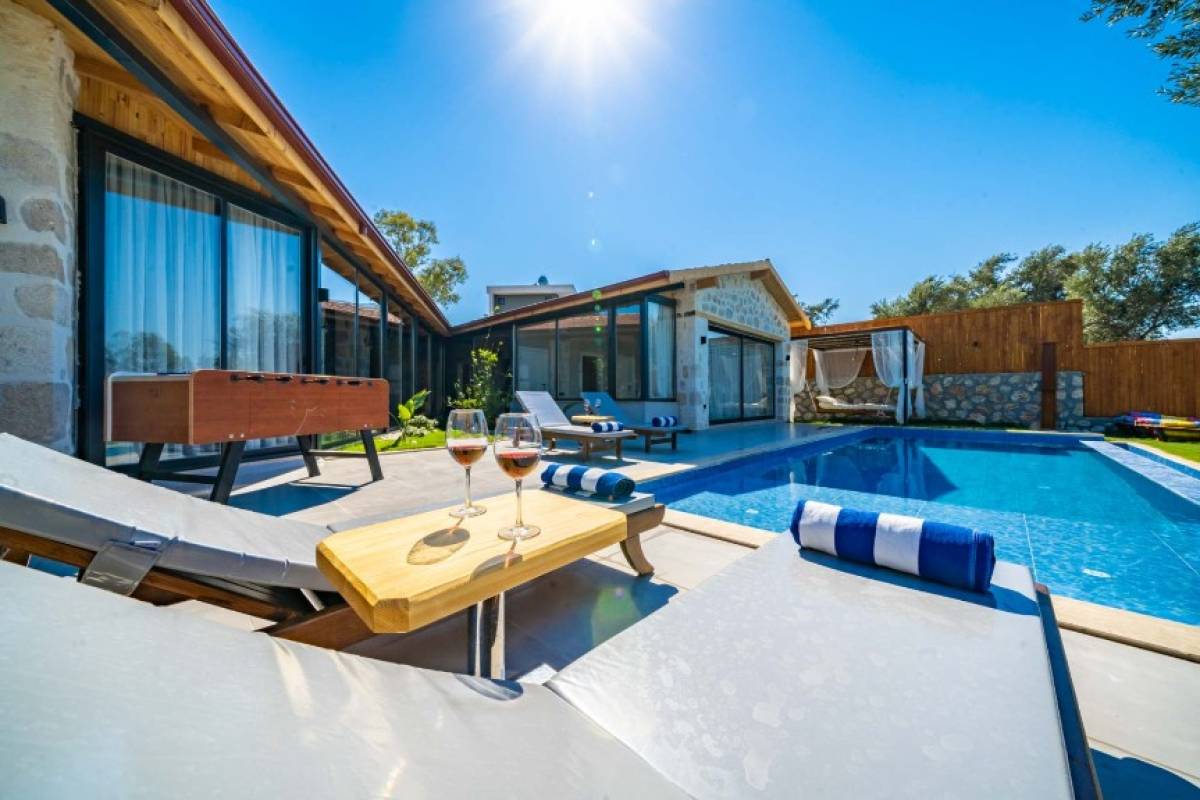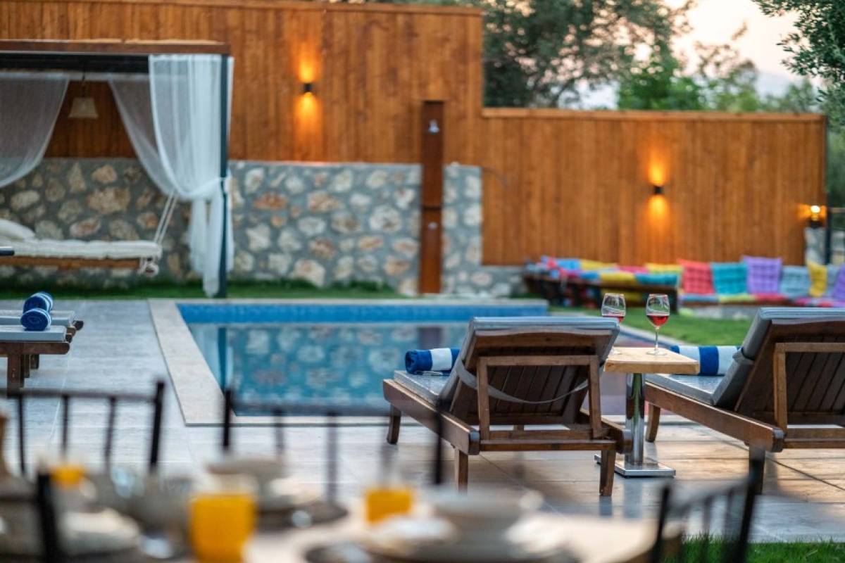 - Havuz Alanı: Havuz başında 4 şezlong ve havuz başı yatak ile rahatlamanız için her detay düşünülmüştür. Ayrıca havuz alanı tamamen korunaklıdır.