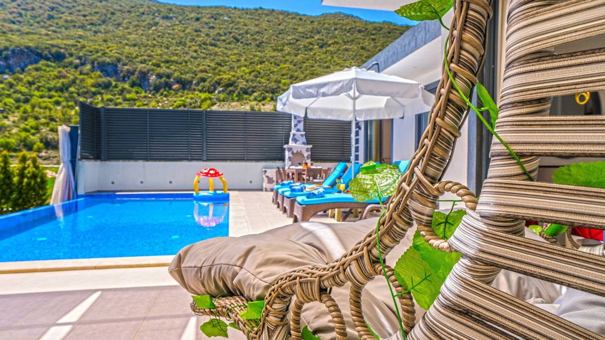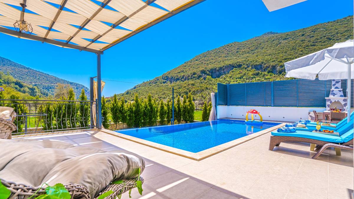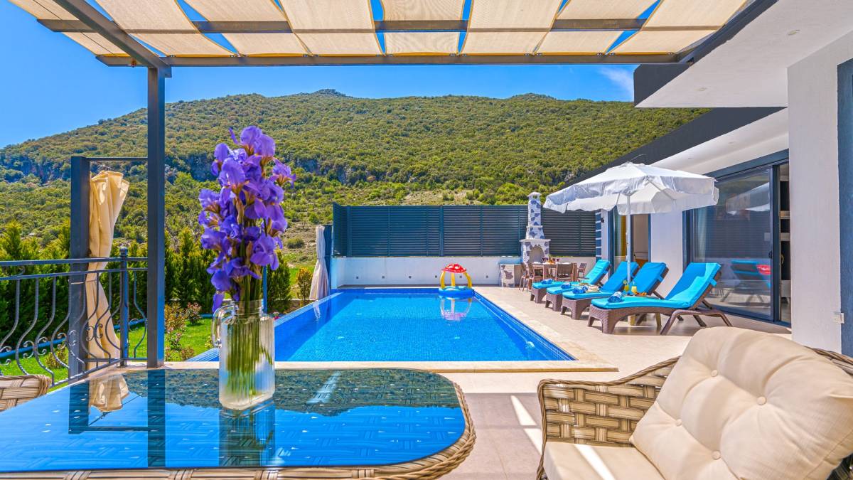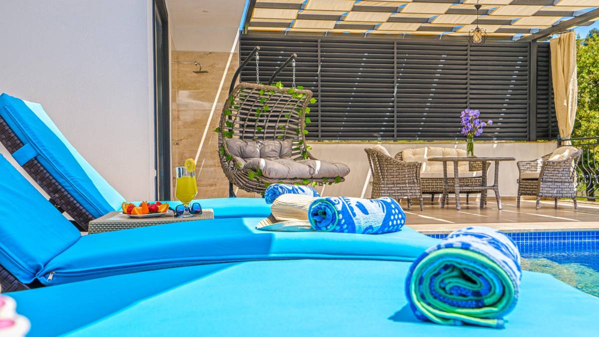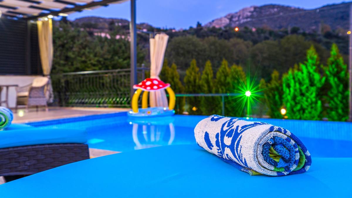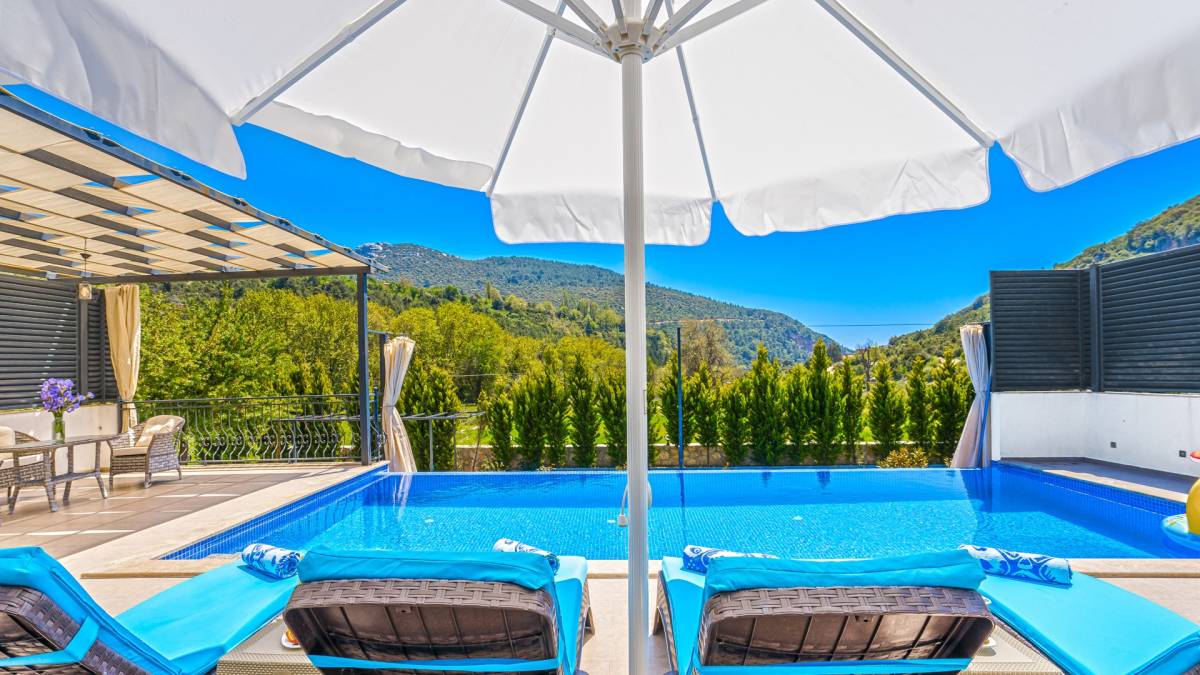 Havuz : Havuz terası korunaklı olup dış taraftan gözükmemektedir. Villamızın havuz terasında şezlong, şemsiye, mangal ve oturma grubu bulunmaktadır.