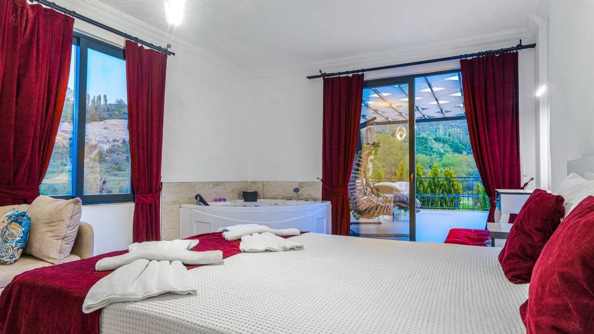 1. Yatak Odası : 1 adet çift kişilik yatak, elbise dolabı, makyaj masası, komodin, jakuzi bulunmaktadır. Banyo ve tuvalet ortak kullanımdır.