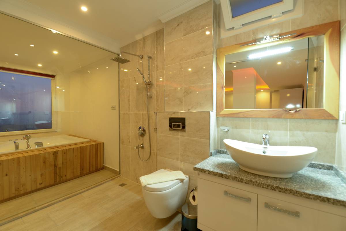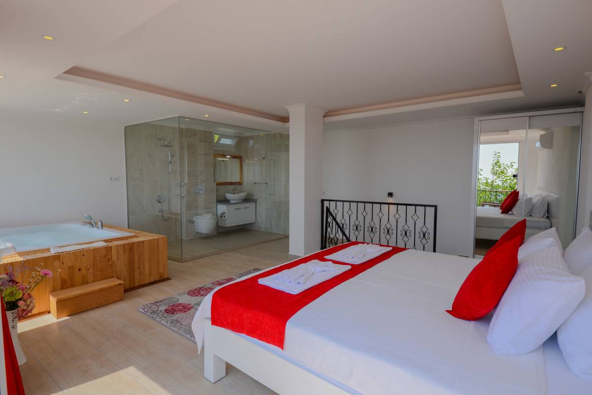 1. Yatak Odası: Oda içerisinde 1 adet çift kişilik yatak, jakuzi, klima gardırop, komodin, banyo-WC yer almaktadır.