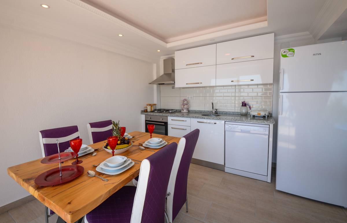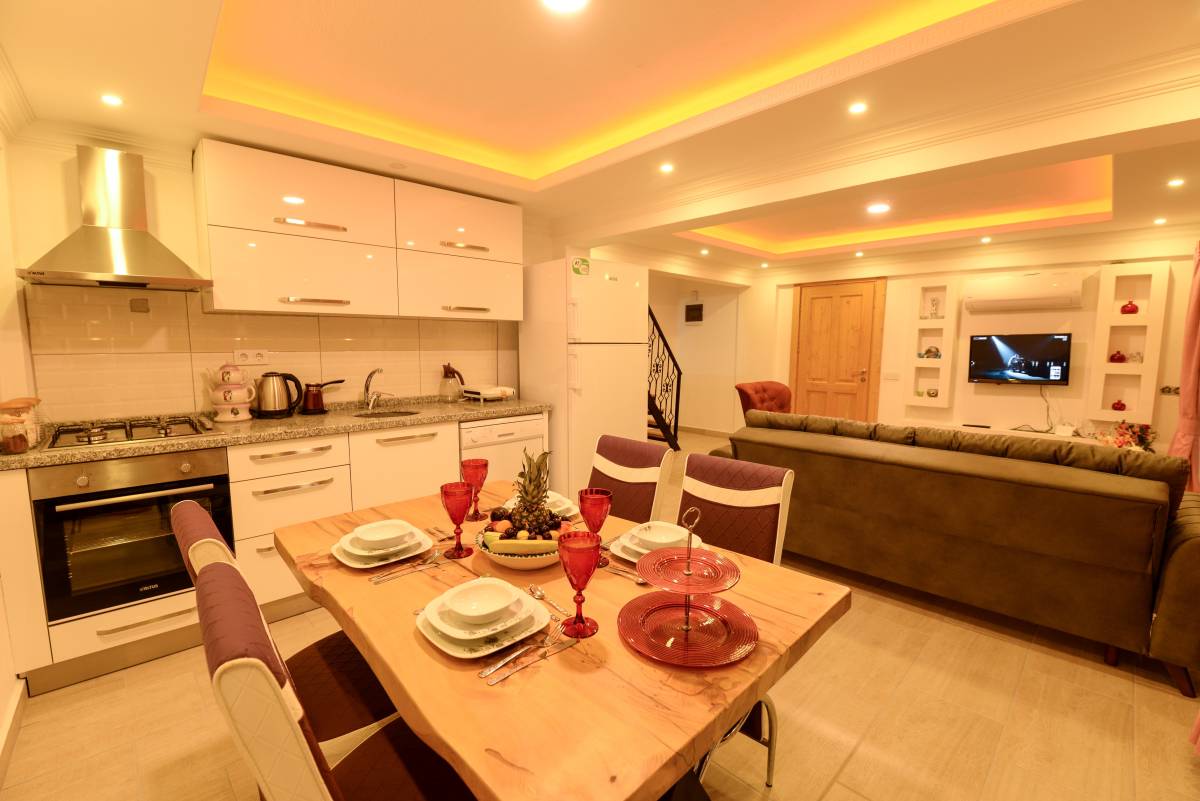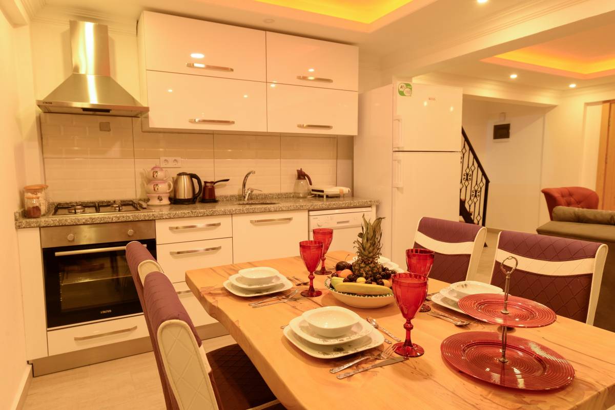 Mutfak: Amerikan mutfak bulunmaktadır. Mutfakta mikrodalga fırın, bulaşık makinası, ankastre fırın, buzdolabı, çamaşır makinası, ankastre 4’lü ocak, elektrikli su ısıtıcı kettle, tencere ve tava takımı, yemek takımı, kaşık ve çatal seti ve bardaklar bulunmaktadır. Mutfak havuz katındadır.