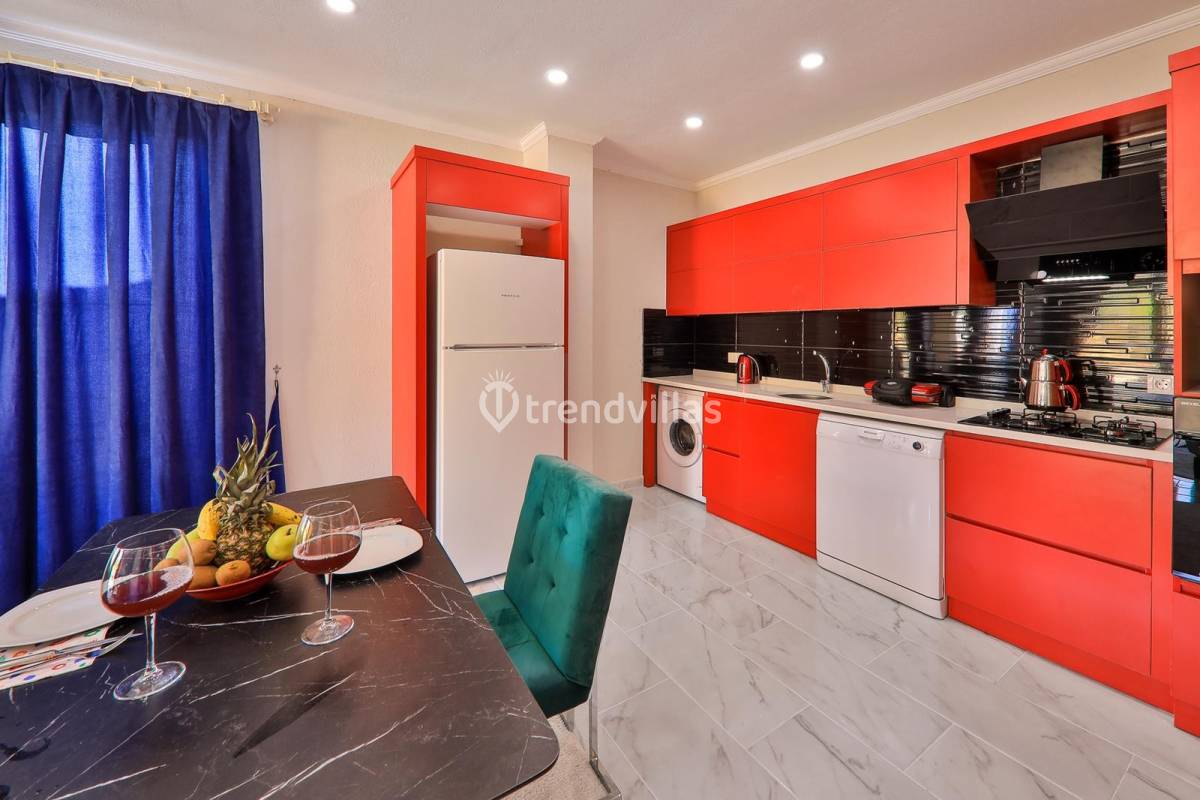 Mutfak : Ferah ve modern dizayn edilmiş Amerikan mutfak, buzdolabı, çamaşır makinesi, bulaşık makinesi, ocak, fırın, mikrodalga fırın, tost makinesi, davlumbaz, 2 kişilik yemek masası ve sandalyeleri, elektrikli su ısıtıcısı, 2 kişilik yemek takımı, çatal, kaşık, bıçak seti ve bardaklar bulunmaktadır.