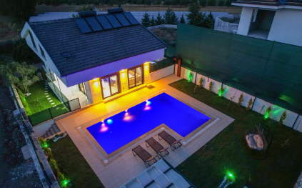 Doğa içinde, huzurlu bir konumu olan villanın havuz bahçe alanında kapasiteye uygun şezlong takımı, oturma grubu, barbekü alanı; havuz terasına açılan oturma odası, tam donanımlı açık mutfağı bulunmaktadır. İki yatak odasında çift kişilik yatak ve ebeveyn banyosu; üçüncü yatak odasında da iki tek kişilik yatak bulunmaktadır. Ayrıca hamam ve kapalı ısıtmalı havuz bulunan villa, dört mevsim tatil planlarınıza ev sahipliği yapmaya adaydır.