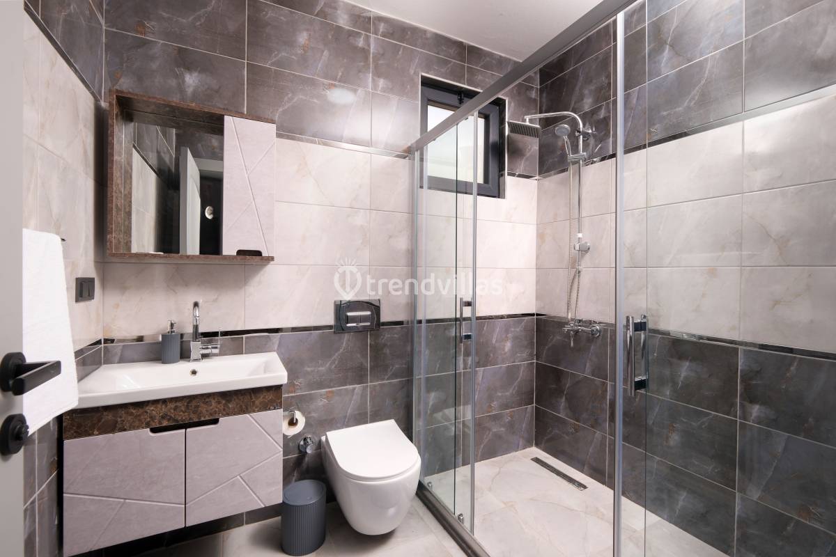 Villanın iç mekânında yer alan üç yatak odasının her birinde klima bulunmaktadır. İki odada çift kişilik yatak, bir odada ise iki tek kişilik yatak yer alır ve tüm odalar ebeveyn banyolu şekilde tasarlanmıştır. Salon alanında oturma grubu, TV, klima ve 6 kişilik yemek masası bulunan ferah bir yaşam alanı sunulmaktadır. Açık plan mutfak tam donanımlı olup buzdolabı, ankastre fırın-ocak, bulaşık ve çamaşır makineleri, temel mutfak gereçleri ve yemek takımları ile donatılmıştır; böylece tatil boyunca ev konforunda yemek hazırlama imkânı sağlar.