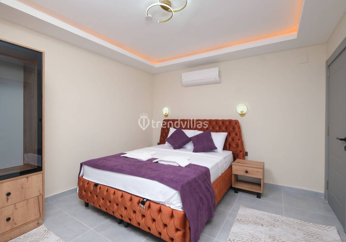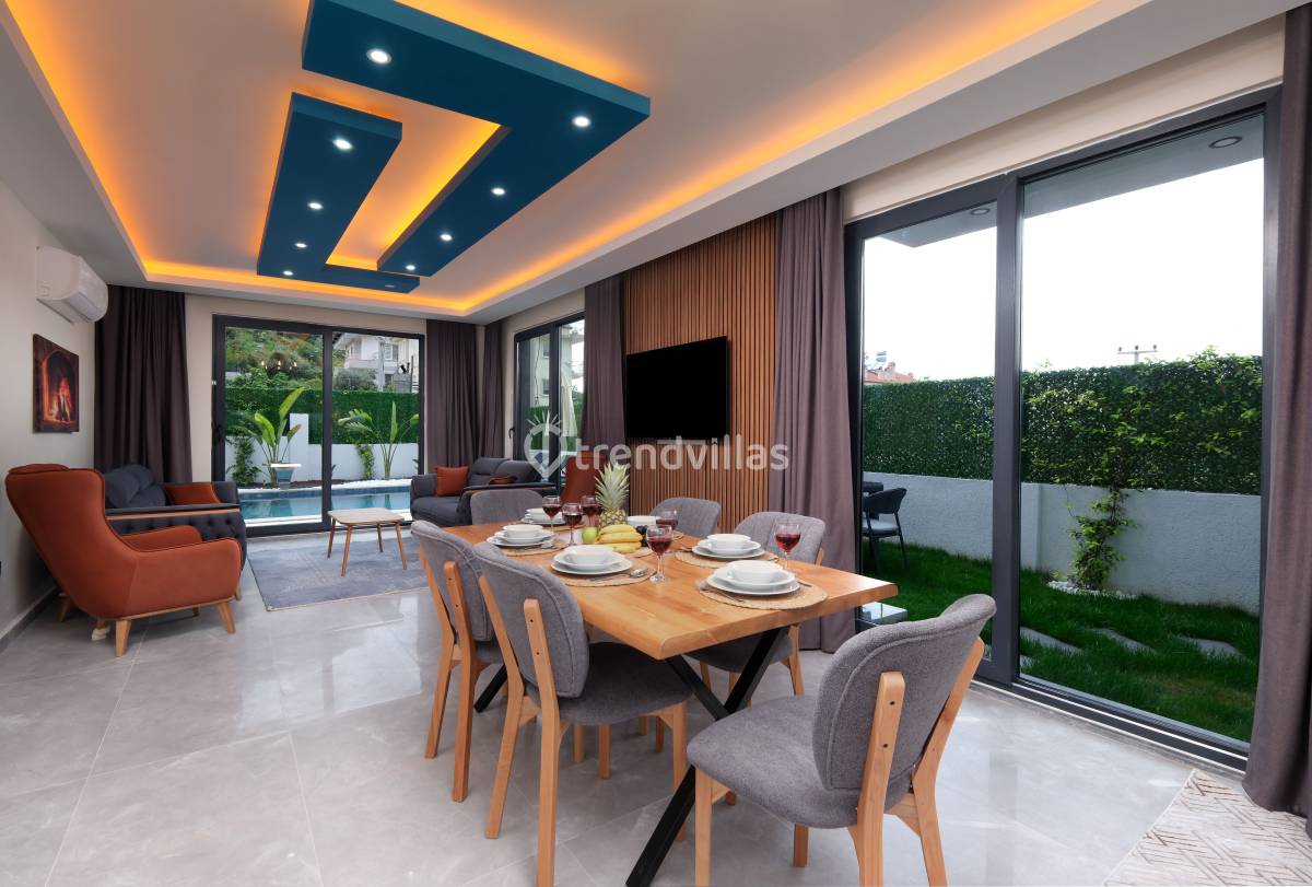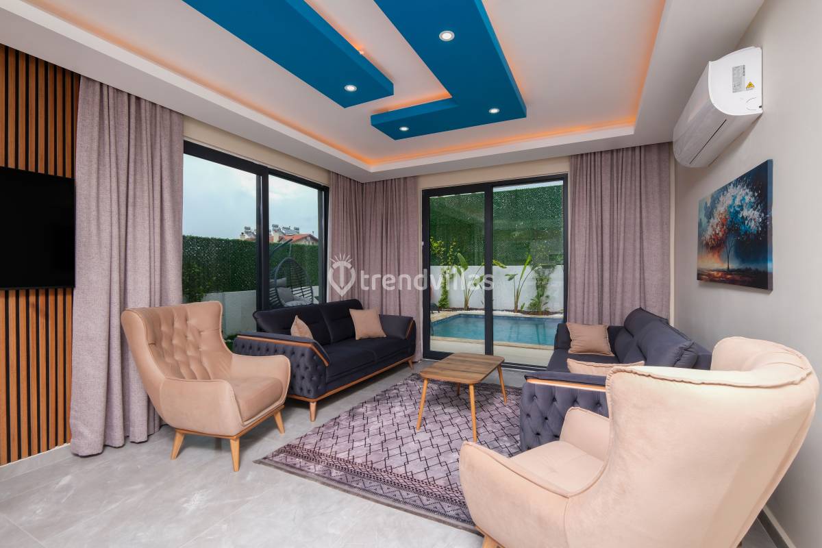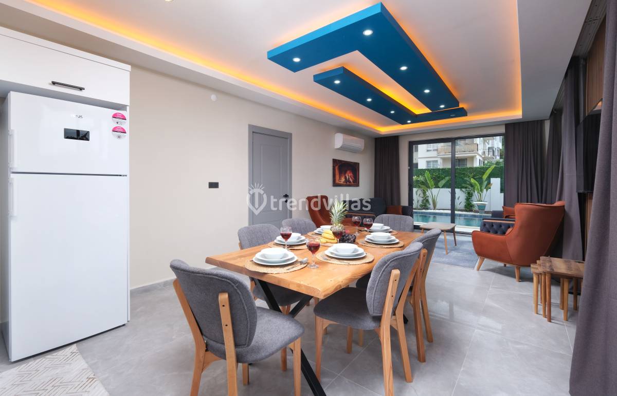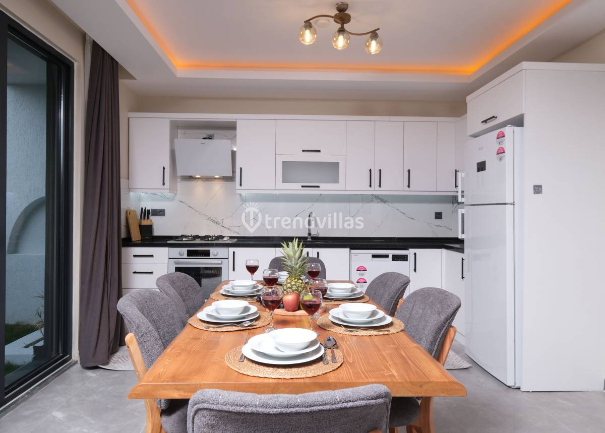 Villanın iç mekânında yer alan üç yatak odasının her birinde klima bulunmaktadır. İki odada çift kişilik yatak, bir odada ise iki tek kişilik yatak yer alır ve tüm odalar ebeveyn banyolu şekilde tasarlanmıştır. Salon alanında oturma grubu, TV, klima ve 6 kişilik yemek masası bulunan ferah bir yaşam alanı sunulmaktadır. Açık plan mutfak tam donanımlı olup buzdolabı, ankastre fırın-ocak, bulaşık ve çamaşır makineleri, temel mutfak gereçleri ve yemek takımları ile donatılmıştır; böylece tatil boyunca ev konforunda yemek hazırlama imkânı sağlar.