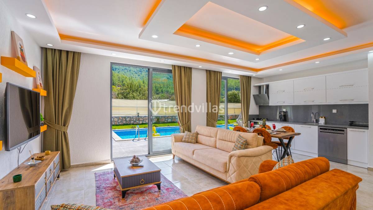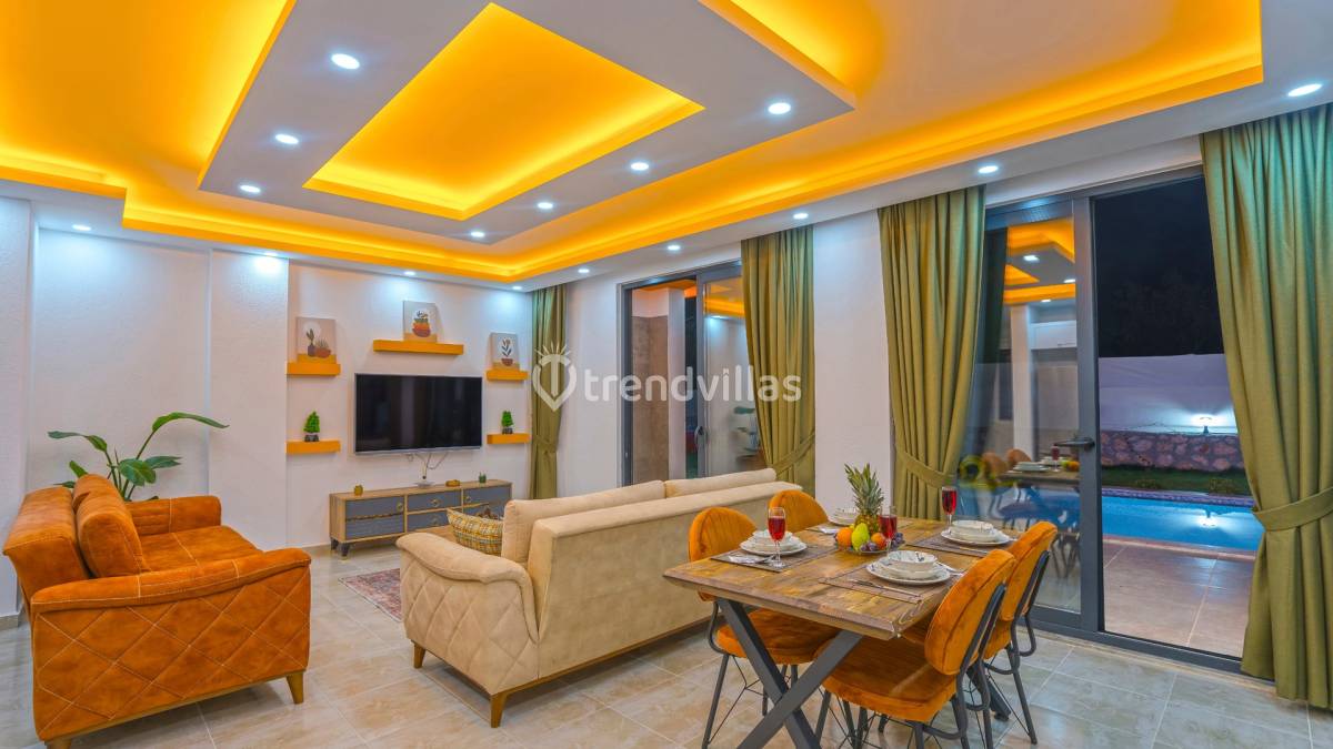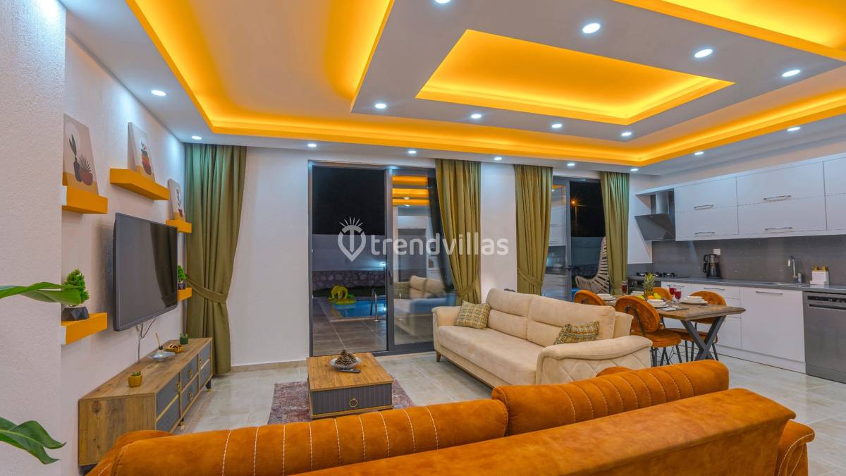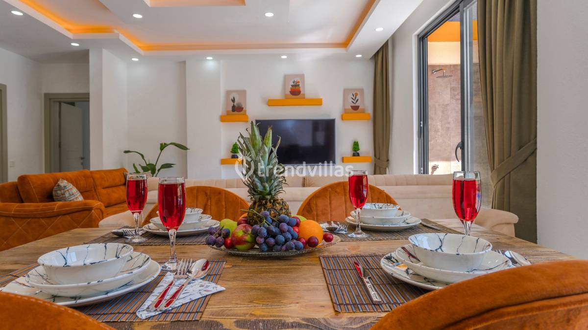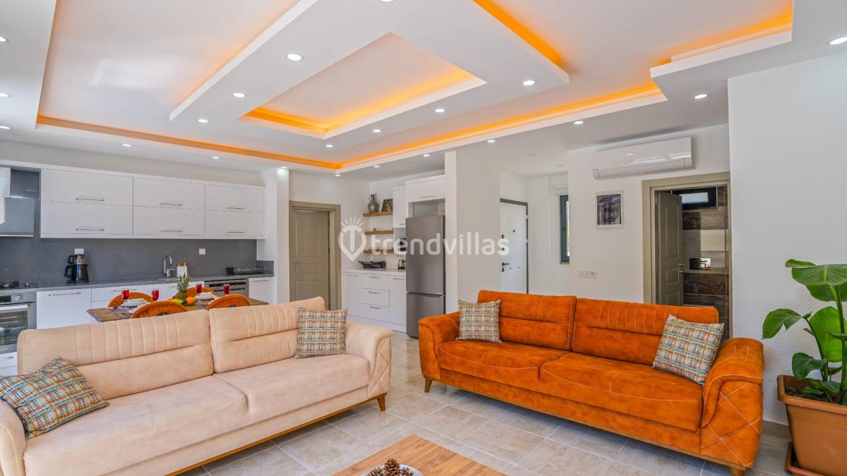 İç mekânlarda modern ve kullanışlı oda planı ön plandadır. Günlük yaşamı kolaylaştıran düzeni ve sade dekorasyon anlayışı, tatil süresince ferah bir atmosfer oluşturur. Ortak yaşam alanları ile yatak odaları arasında dengeli bir kullanım sağlanmış, konaklama süresince rahatlık önceliklendirilmiştir.