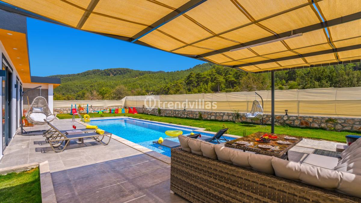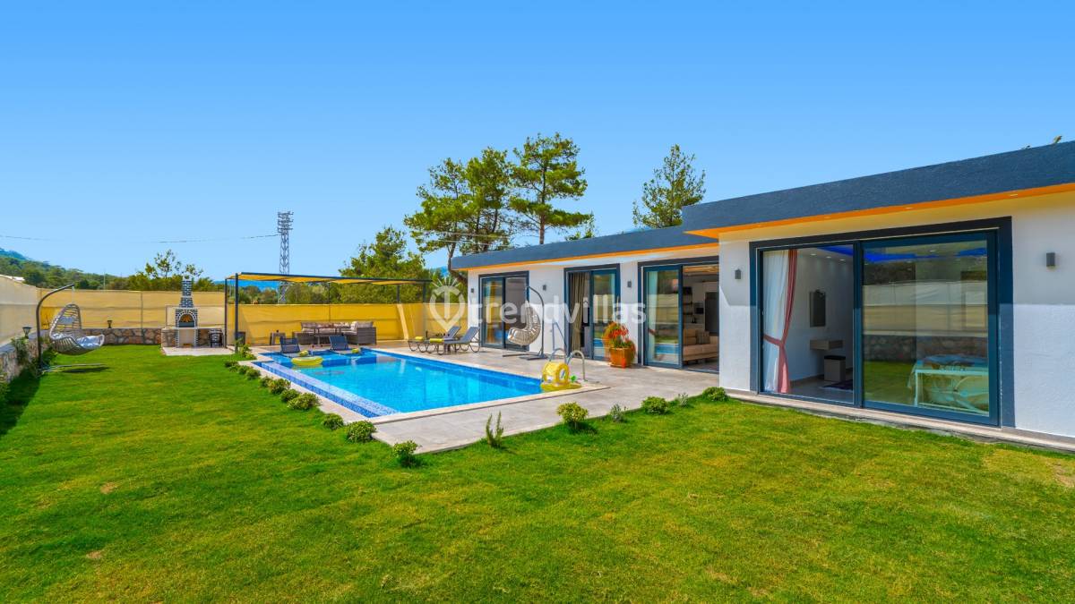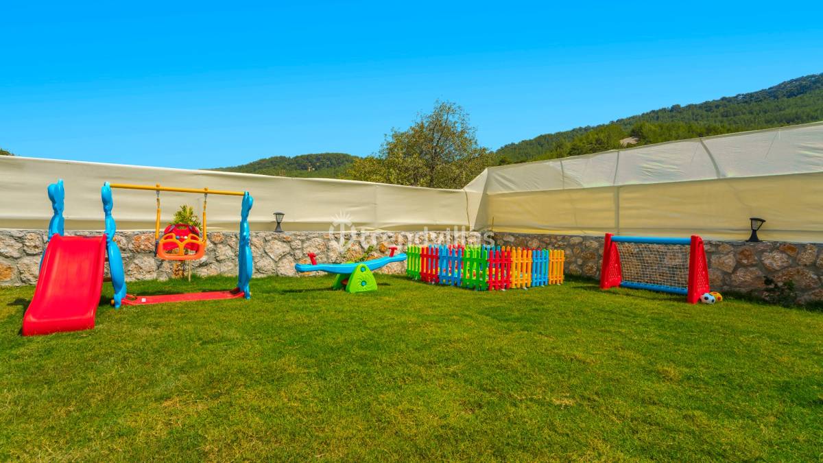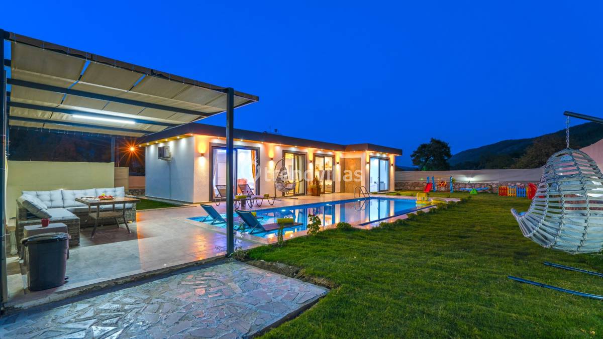 Villanın dış alanında yer alan özel yüzme havuzu ve geniş yeşil bahçe, açık havada vakit geçirmek isteyen misafirler için ferah bir ortam sunar. Bahçe içerisinde bulunan çocuk oyun alanı, aileler için rahat ve keyifli bir kullanım sağlar. Ayrıca villaya ait özel 3 araçlık otopark, ulaşım açısından önemli bir kolaylık sunar.