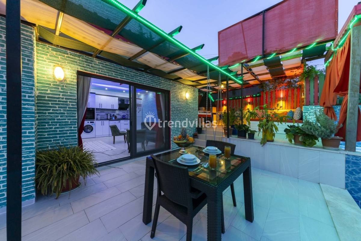 Doğa ve vadi manzarasına açılan geniş terası, günün her saatinde keyifli vakit geçirmek için ideal bir alan oluşturur. Havuz ve dış alan dışarıdan görünmeyecek şekilde planlanmış olup korunaklı villa konseptine uygun yapıdadır. Bu özelliği sayesinde muhafazakar villa tercih eden çiftler için mahremiyet ön planda tutulmuştur.
